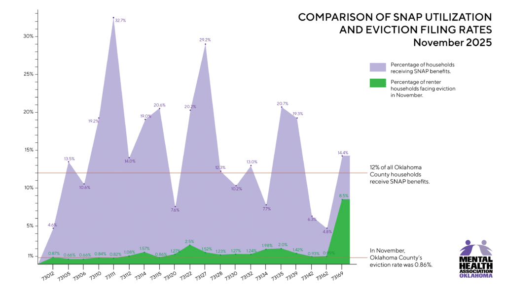 Between November 12 and November 26, staff from Mental Health Association Oklahoma, with support from Legal Aid Services of Oklahoma (LASO), surveyed tenants facing eviction in Oklahoma County. We asked questions, and we listened to mothers just like these, and to so many others whose already-precarious financial stability collapsed when the SNAP benefits they depend on disappeared.
